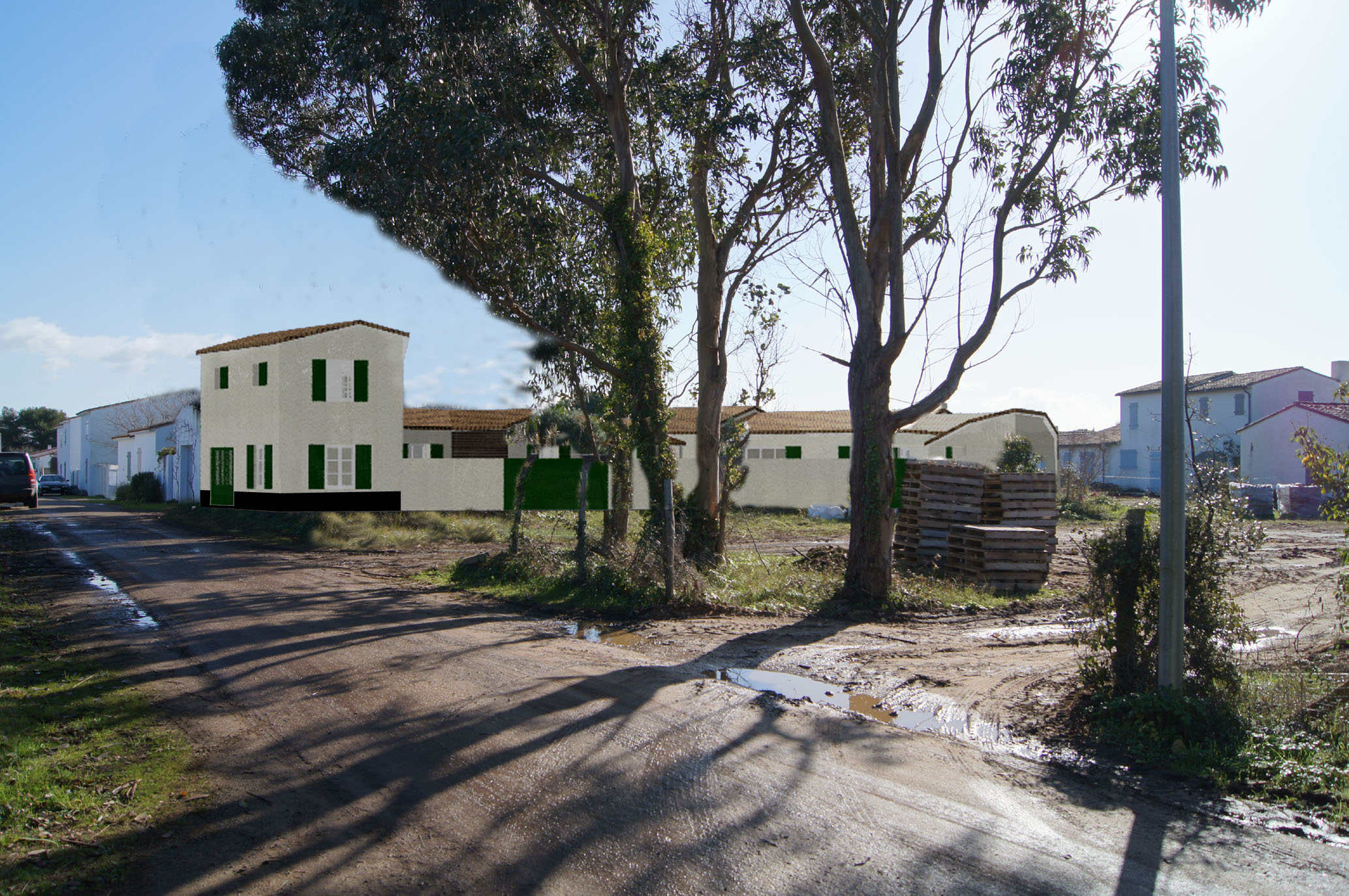 Cette maison est en ossature métallique, avec bardage métallique noir, s’inspirant des cabanes de pêcheurs. Ce choix de structure vient du fait que le projet doit être parasismique, et cette construction serait moins onéreuse qu’un bâtiment en maçonnerie traditionnelle, de plus cela vient ajouter un coté original.
