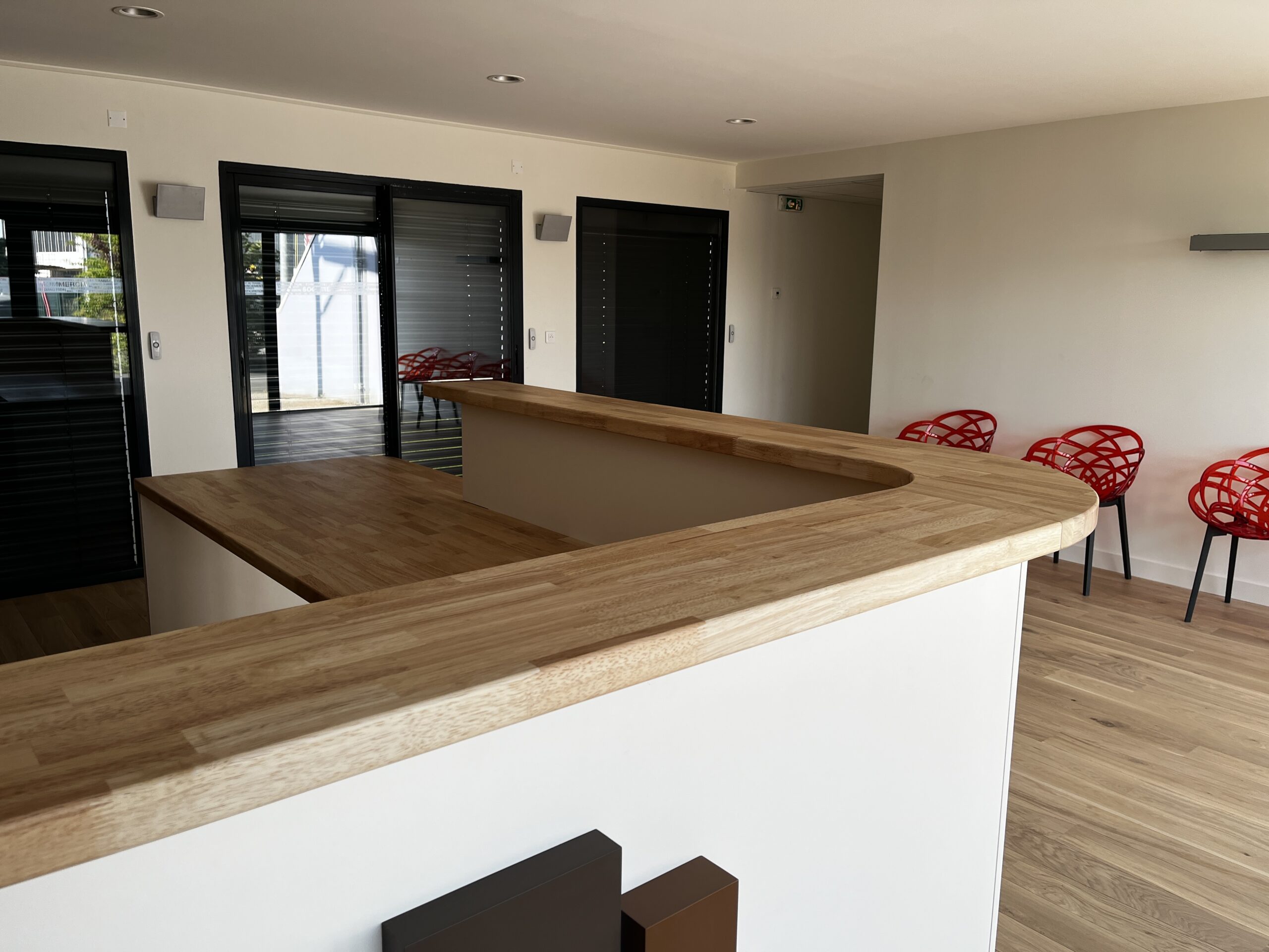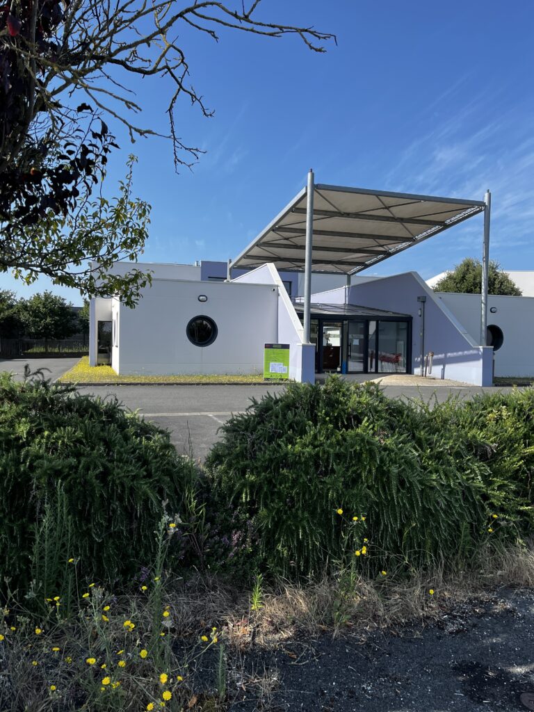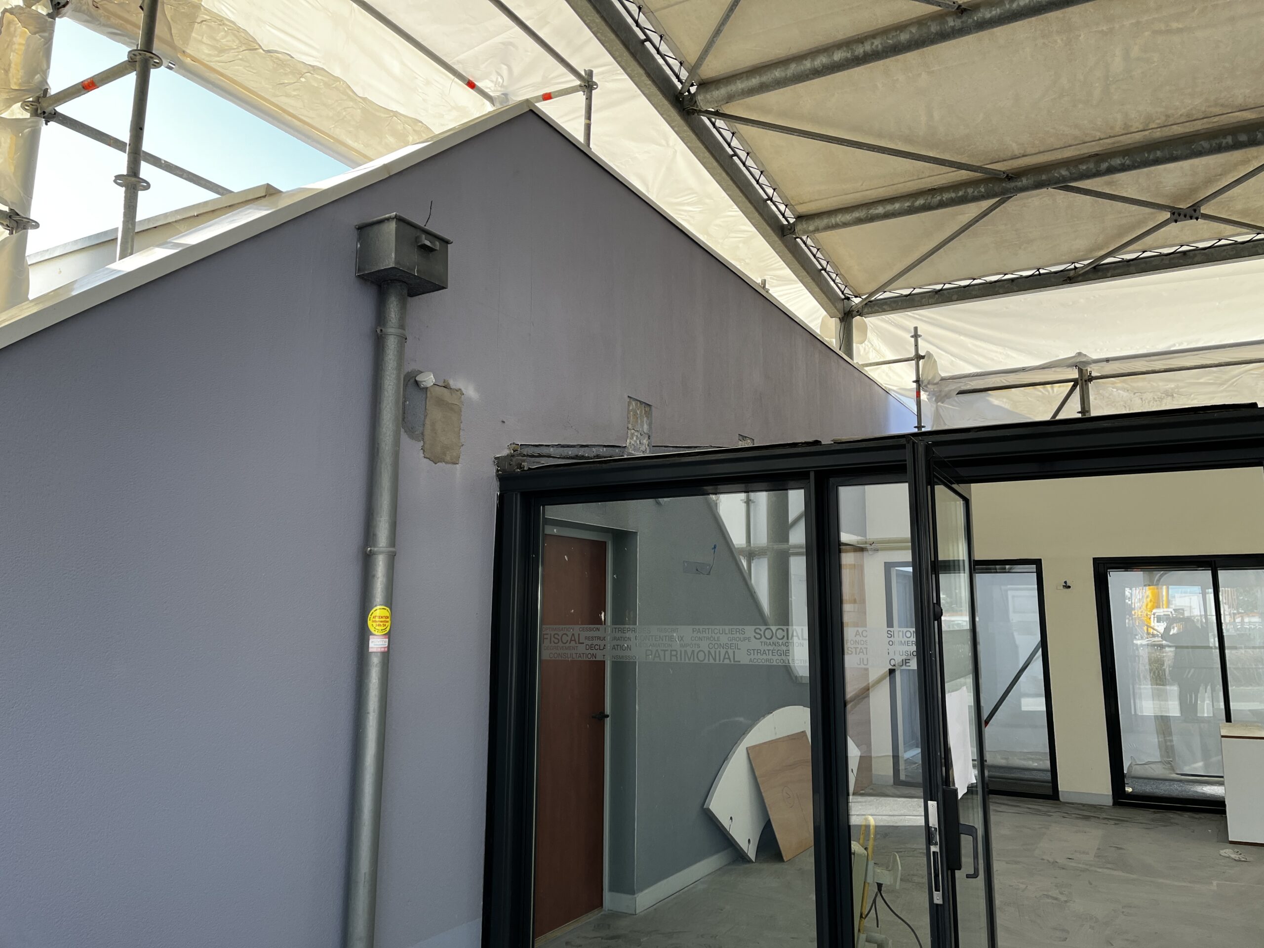Le nom du cabinet a été ajouté en façade, et la structure métallique qui supportait des voiles d’ombrage a été renforcée pour accueillir des panneaux solaires.